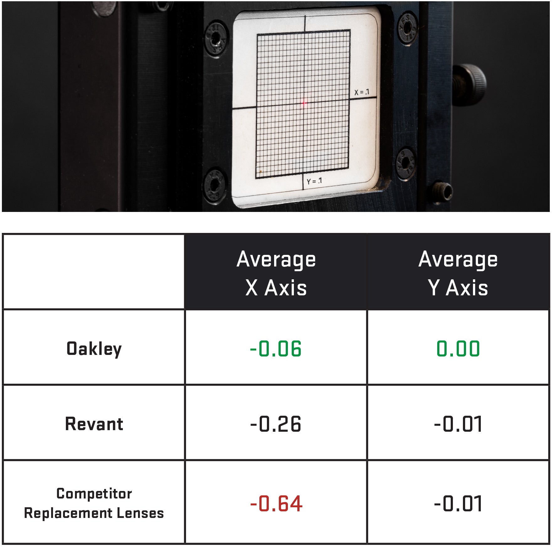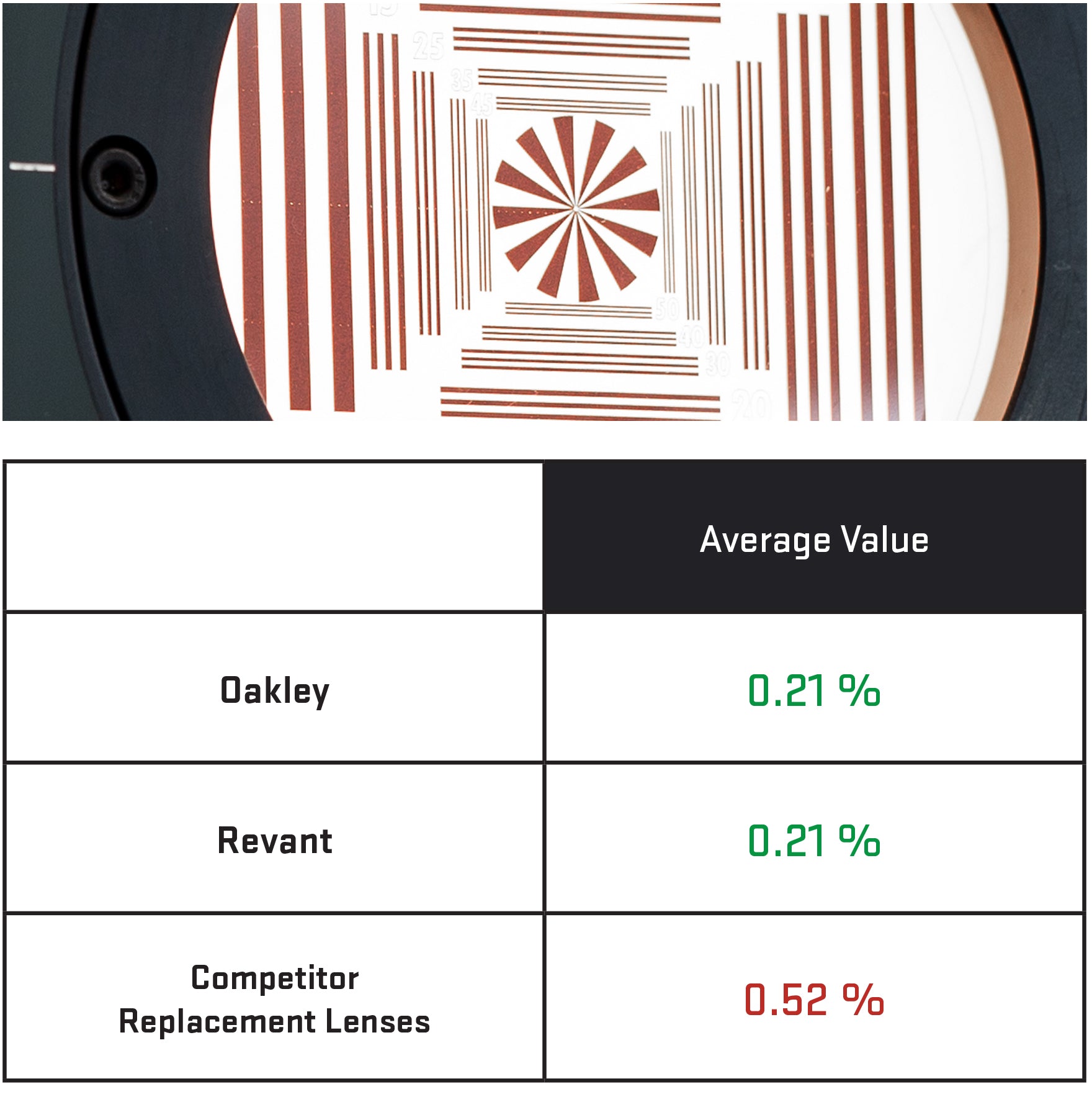 Revant matches Oakley in lens haze reduction with 2.5x the optical precision of the competitor replacement lenses.