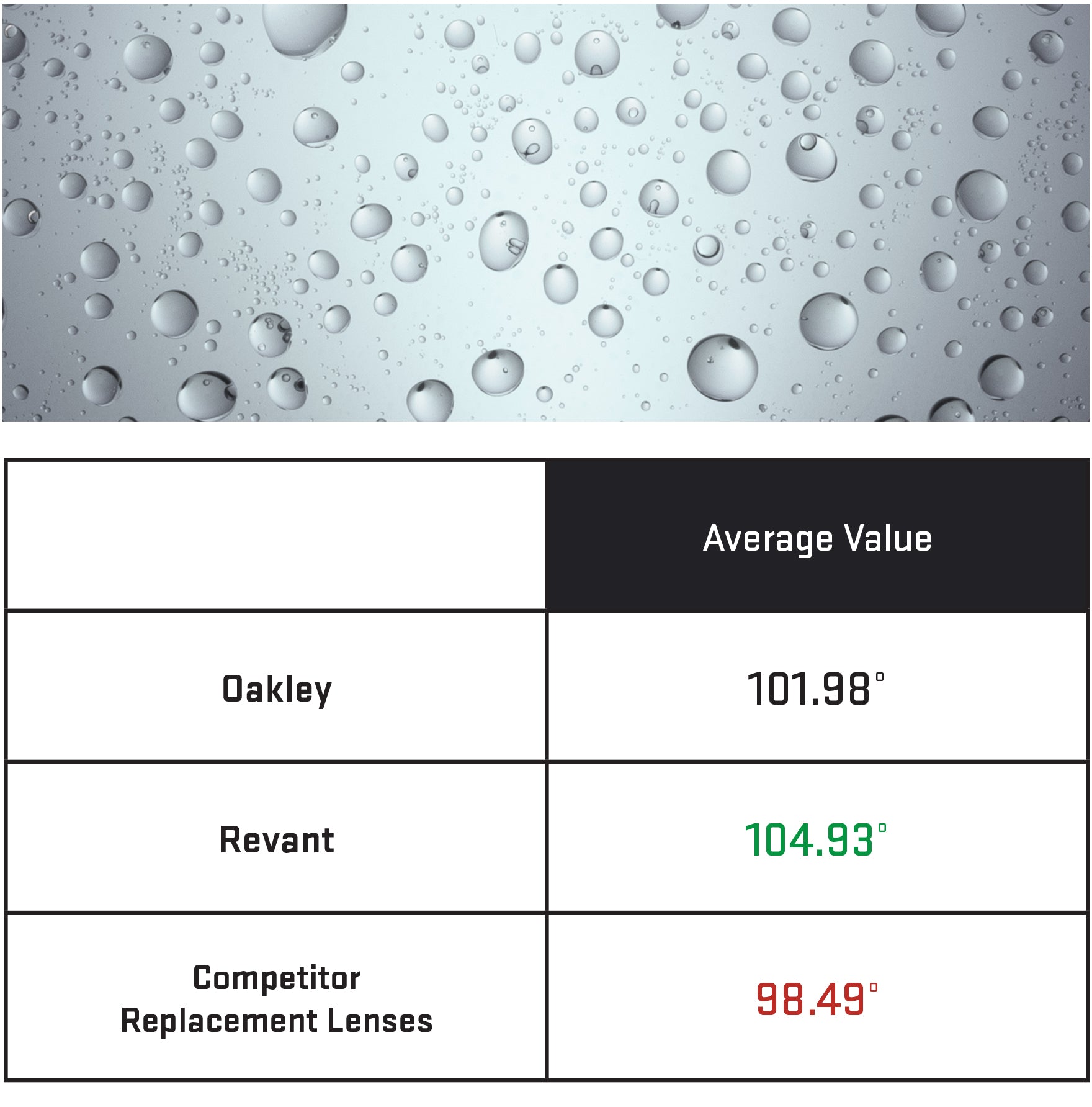 Revant is as good as Oakley in Hydrophobic performance.